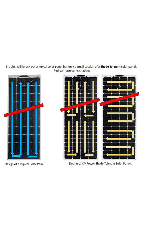 Shade Tolerant Walk-on Solar Panels- Solar panel shading is a major issue on many boats. Shading can reduce a standard panel performance by over 60%. Custom Marine Products has developed a series of semi-flexible and semi-rigid shade tolerant solar panels that have superior performance when partially shaded by boat equipment or nearby objects. These shade tolerant panels are ideal for bimini and dodger mounting where there is boom, mast and instrument pole shading. Patent pending