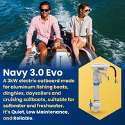 The ePropulsion Navy 3.0 Evo is a premium electric outboard motor built for aluminum fishing boats, dinghies, daysailers, and cruising sailboats. Delivering the performance of a traditional 6HP gas outboard, it combines quiet operation, low maintenance, and eco-friendly propulsion for a modern boating experience. Designed for use in both freshwater and saltwater, the Navy 3.0 Evo is the ideal choice for boaters who want reliable performance with zero emissions.