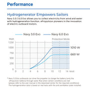 Powered by direct-drive technology, the Navy 3.0 Evo operates with ultra-low noise and vibration, while requiring far less maintenance than gas engines. It also features hydrogeneration, allowing your battery to recharge while sailing—perfect for extended adventures and sustainable cruising.