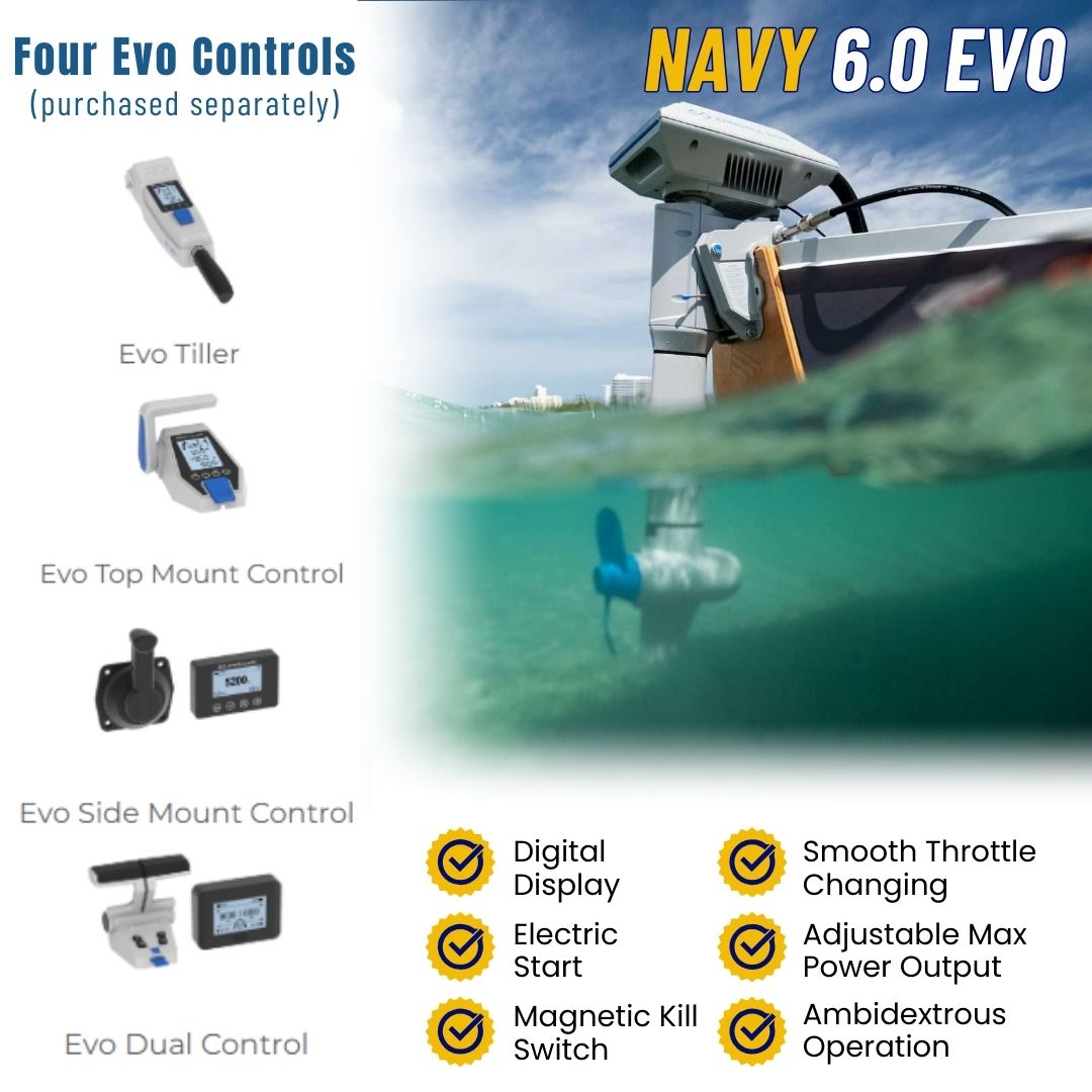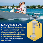 The ePropulsion Navy 6.0 Evo is a high-performance electric outboard motor designed for aluminum fishing boats, dinghies, daysailers, and cruising sailboats. Comparable to a 9.9HP gasoline outboard, it delivers powerful propulsion with the advantages of quiet operation, minimal maintenance, and zero emissions. Built for both freshwater and saltwater use, the Navy 6.0 Evo offers dependable performance while promoting a cleaner, eco-friendly boating experience.