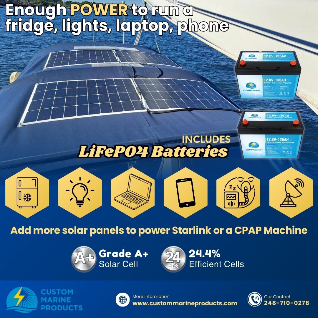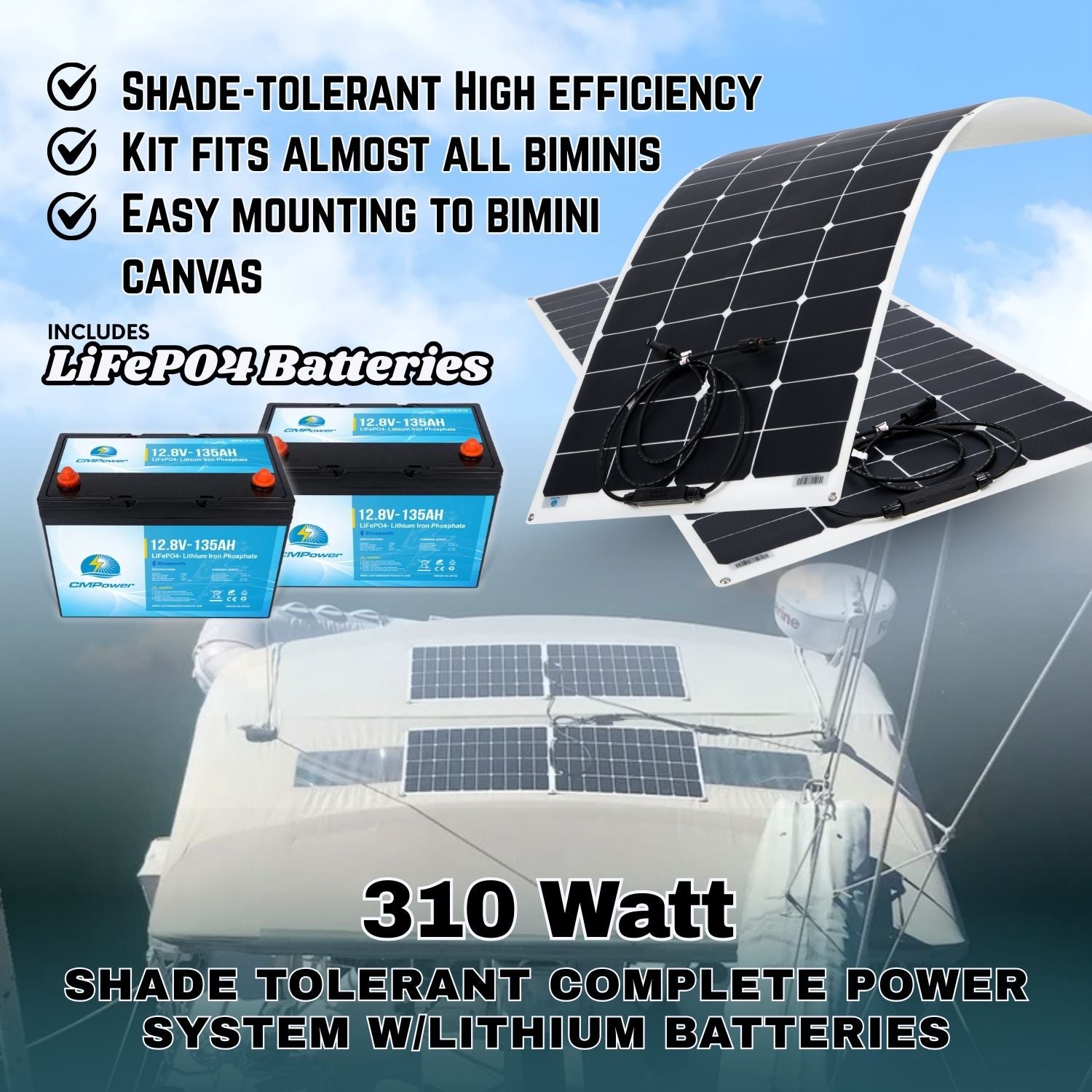 This 310 Watt Shade Tolerant Complete Power System Kit for your bimini fits most sailboats and powers your fridge, lights, cell phones, and laptops while cruising for weeks. Includes Batteries!