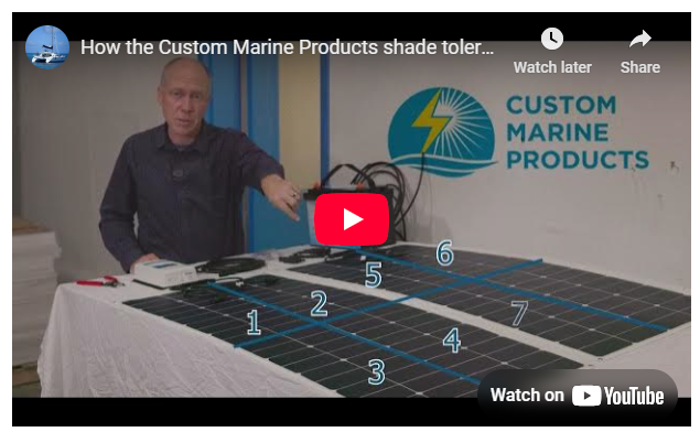 Solar panel shading is a major issue on many boats. Shading can reduce a standard panel performance by over 60%. Custom Marine Products has developed a series of semi-flexible shade tolerant solar panels that have superior performance when partially shaded by boat equipment or nearby objects. These solar panels have high performance SunPower Maxeon cells. The diagram to the left illustrates how these amazing panels work.The junction box is mounted in the center or the edge of the panel enabling the panel to have four quadrants of solar cells linked in series and isolated with diodes. If one or two quadrants are shaded, the other quadrants perform at normal output. The result is a panel that will provide up to three times the output of a standard panel when shaded. These shade tolerant panels are ideal for bimini and dodger mounting where there is boom, mast and instrument pole shading. Patent pending