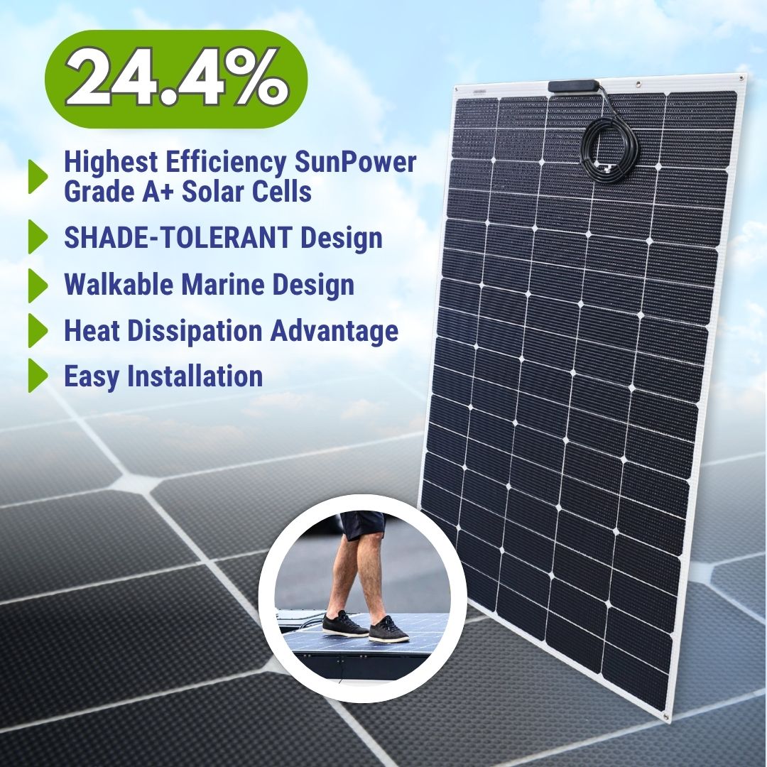 Built with SunPower A+ Grade 24.4% efficient solar cells, this panel delivers superior performance in both full and partial sunlight. Its shade-tolerant design ensures consistent energy production even in challenging lighting conditions — ideal for boat decks, camper roofs, and van setups.