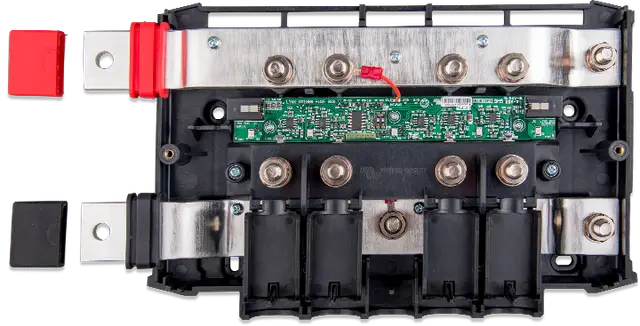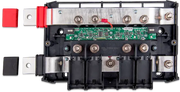 A modular DC busbar with spaces for four DC fuses. It monitors the status of each fuse and displays its condition with an LED on the front. The Lynx Distributor is part of the modular Lynx distribution system, available as M8 and M10 models.