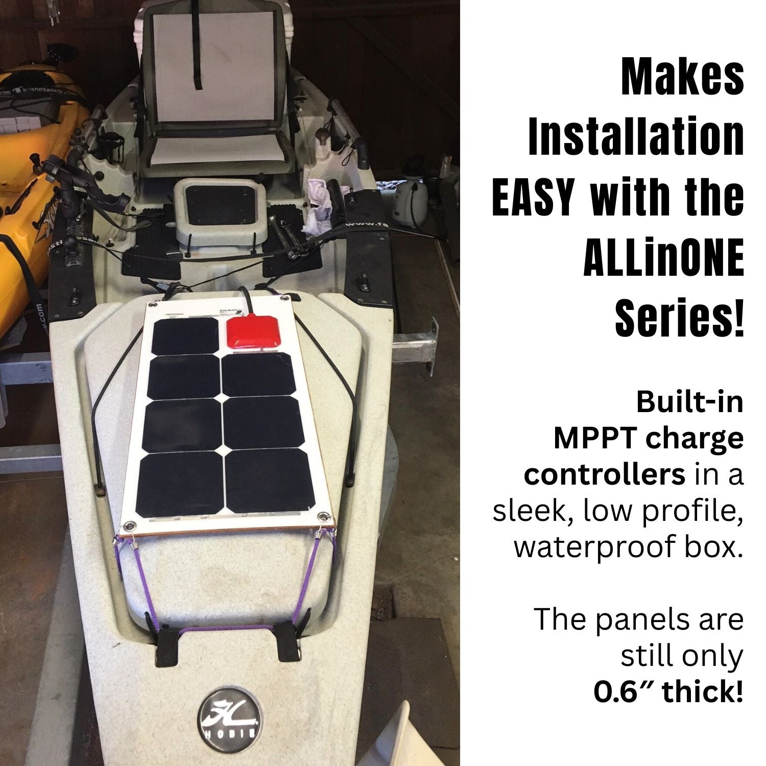The ALLinONE 2.0 Connect is a premium marine solar solution designed for those who demand both performance and personalization. This innovative panel integrates a high-efficiency solar module with an MPPT Boost/Buck charge controller built directly into the panel — so all you need to do is connect it to your battery.